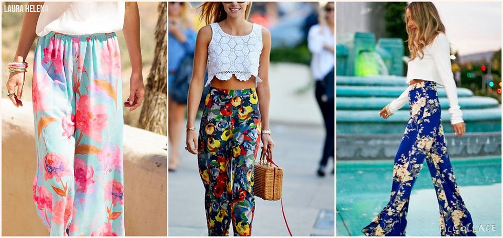 Fugindo um pouco das blusas e vestidos, uma boa opção onde as flores ficam lindas são em calças. As mais soltinhas com tecido mais fluido e confortável, dão um ar mais leve e despojado ao look (e na minha opinião são mais democráticas com os modelos de corpos!), mas com a peça certa ela pode se tornar algo mais social ou até elegante.